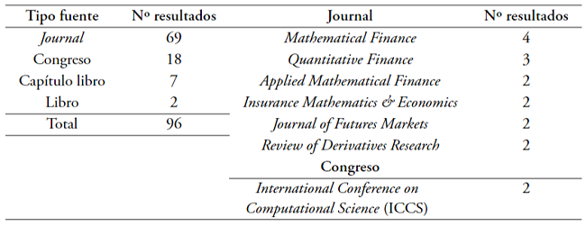 El Anexo A.1 sintetiza las principales características de los 96 estudios considerados y, en los párrafos siguientes, se comentan los aspectos bibliométricos generales del conjunto analizado. Respecto al tipo de fuente (Tabla 2), los resultados provienen mayoritariamente de revistas y en menor medida de congresos y libros. Asimismo, las publicaciones no se encuentran atomizadas, sino que se observa una diversidad de revistas. Solo seis revistas tienen más de una publicación sobre el tema, entre las que se destaca la participación del Journal of Mathematical Finance. Dicha variedad también se observa en las publicaciones provenientes de eventos científicos, donde el único que aporta más de un trabajo es el International Conference on Computational Science.