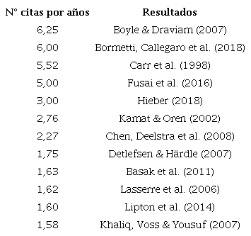 Según la cantidad de citas totales (Tabla 4), existen tres publicaciones seminales y nueve trabajos que presentan entre 16 y 30 citas, los que representan un 12,50 % del total de publicaciones analizadas. Luego hay 52 trabajos con el rango de 1 a 15 citas (54,17 %) y 32 con ninguna referencia externa (33,33 %).
