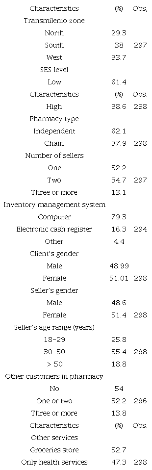 Table 1 summarizes the characteristics of the 298 audited pharmacies. We divided the stations of the transportation system, Transmilenio, into three geographic areas accounting for roughly the same proportion of visited pharmacies. The high socioeconomic strata6 (SES) are concentrated in the north and west zones. Thirty-nine per cent of the visited pharmacies are located in areas classified as being of high SES. Regarding ownership of the visited pharmacies, 62% of them were independent and the remaining 38% belonged to a chain. This prevalence of small independent pharmacies is also evident in the large proportion of harmacies in which, by the time of the visit, there was only one seller (52%). In terms of the inventory management, the simulated clients observed that in 79% of the visited pharmacies the inventory was handled by computer and another 16% with electronic cash registers. Moreover, 53% offered services or even sold goods over and above pharmaceutical products or basic health services. This includes beauty products, photocopies, toys, groceries, among others. Most pharmacies offer packed ice-creams, sodas or bottled water, as this has been a traditional distribution channel of these firms.