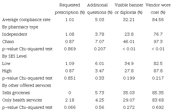 We also report in Table 2 whether we observe differences in these outcomes by pharmacy type (i.e., independent or belonging to a chain), by the socio-economic status of the block in which the pharmacy is located (high SES versus low SES), and by the extent of offered services (only health services versus selling groceries). We do not find any difference across pharmacy type for the outcome variables with the lowest compliance rate, the request of a prescription and further questions about the younger sister for whom the pills are being bought. By contrast, we find that pharmacies belonging to a chain were more likely to hold a visible operating banner or diploma (46%) than the independent pharmacies (24%), and it was also more likely that in these pharmacies the vendor wore a white coat at the time of the interaction (97% compared to 77% in the independent pharmacies).