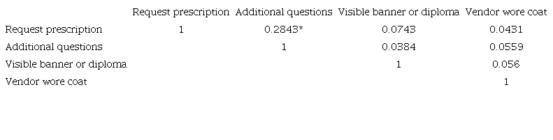 Table 3 complements these findings with a report of the correlations between the four outcome variables. All the correlations are low (i.e., lower than 0.100) except for the correlation between requesting the prescription and asking further questions about the specific brand of pill. The latter correlation is 0.28 and it is statistically significant at the 10% level. In general, we confirm that aesthetic quality signals are not correlated with more objective quality signals.