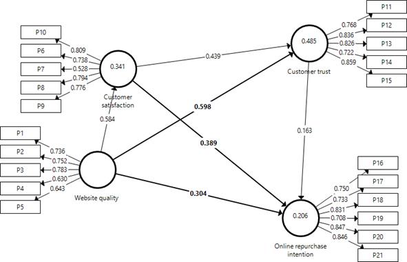 Abstract: COVID-19 has led to social isolation and a subsequent increase in online shopping has been observed. The present study is based on theory of reasoned action and focused on 371 Peruvian consumers, it seeks to evaluate the current effect of the website quality, customer satisfaction, and customer trust in online repurchases. The current study is cross-sectional and uses an online survey with 22 questions that evaluated consumers repurchase intentions. A technical SEM-PLS analysis was used. It was found that website quality had a positive influence on customer satisfaction, website quality positively influenced customer trust, customer satisfaction had a positive influence on customer trust, customer satisfaction had a positive influence on online repurchase intention, and customer trust had a positive influence on online repurchase intention. The model explained 20.6% of online repurchase intention behavior. Outcomes of the bootstrapping test were used to evaluate if path coefficients are significant. The outcomes can help companies to develop strategic plans to increase online purchasing. The novelty is based on using the partial least squares structural equation modeling (SEM-PLS) technique.
