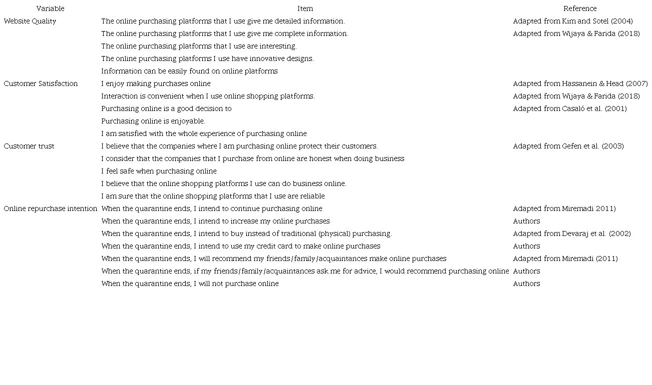 The questionnaire consisted of two sections. The first part collected socio-demographic information from consumers; the second used questions based on the instruments developed by Wijaya & Farida (2018) to evaluate the factors that, according to the literature reviewed, are associated with online repurchase intention. The original items were translated and adapted linguistically. The section related to online repurchase intention and associated factors consisted of 22 items grouped into four dimensions. All the reagents are assessed through a Likert-type scale of five response options (From 1 = completely disagree to 5 = agree): Quality with five items, satisfaction with five items, trust with five items, and online repurchase with items. In the current study, the source of the scales is in accordance with the information in Table 1.