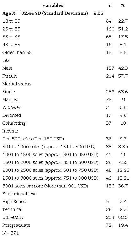 We conducted a cross-sectional online survey. The survey used in the study consisted of an online questionnaire in Google surveys sent via social media. The questionnaire was made anonymous, ensuring data confidentiality and reliability. This survey was shared in Spanish, as this is the official language in Peru. The survey was performed from May 2 to 25, 2020. Responses were collected from 371 participants. For data collection purposes consumers who agreed to participate in the study were required to respond yes/no which asked the following questions: “I have freely decided to participate in the study”, “I understand that my participation is voluntary” and “I have received information about the objectives of the study”. Incomplete questionnaires were rejected. The data collected was be tabulated and analyzed using the statistical programs SPSS version 26 and SmartPLS version 3.3.2 The data quality was monitored, ensuring that each response was counted only once and to discard incomplete questionnaires. The sample consisted of 371 consumers, 157 men (42.3%) and 214 women (57.7%), between 18 and 69 years of age. The average age was 32.44, with a standard deviation of 9.65 years. This data shows that most participants were young people. Also, 91.9% of respondents had completed tertiary education and 68.2% were single. This sample from the city of Lima in Peru has a 95% confidence interval and 5.09% margin of error. The description of the sample according to sociodemographic variables is presented in Table 2.