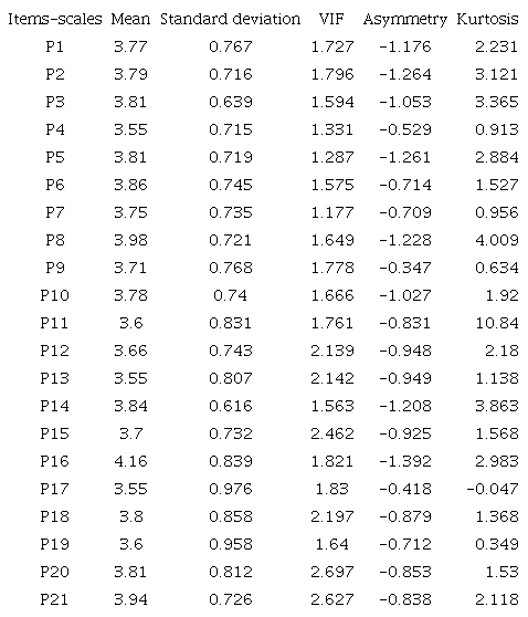Before determining the instrument’s validity and reliability, a descriptive analysis of the items and scales was conducted through the mean, standard deviation, asymmetry, and kurtosis (see Table 3). Likewise, the absence of collinearity was corroborated with VIF values (variance inflation factors), which are less than five (5).