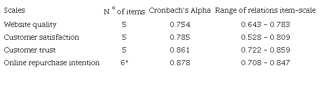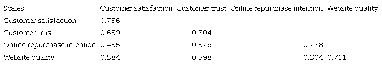 The scales of t Website Quality, Customer Satisfaction, Customer trust, and Repurchase intention presented reliability coefficients (Cronbach’s Alpha) higher than the expected minimum of (5) in exploratory analysis (see Table 4).