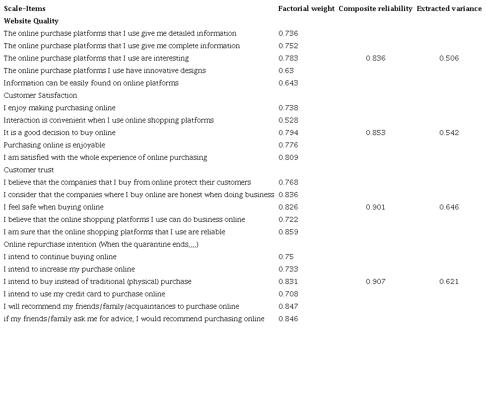 The present study’s objective was to test the model’s website quality, customer satisfaction, customer trust, and repurchase intention among Lima consumers. Discriminant validity and reliability (internal consistency- Cronbach’s alpha coefficient and composite reliability) were verified. The results obtained show that the questionnaire results are valid, reliable, and statistically relevant in the application. As verified in previous studies, the scales that make up the questionnaire showed reliability and validity.