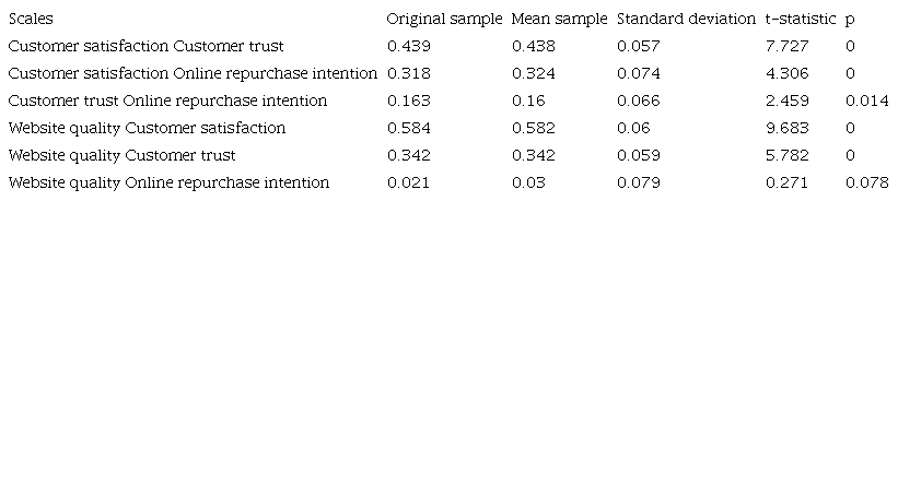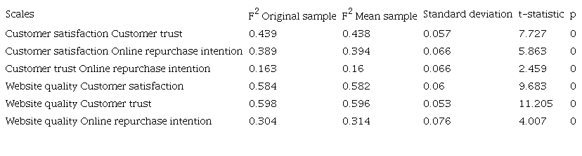 Also, through the calculation of the size of the effect (F2) (Table 8), it was established that Website quality has a significant direct effect on Customer satisfaction (F2 = 0.584), Customer satisfaction has a significant direct effect on Customer trust (F2 = 0.439), and Customer trust has a small but significant direct effect on Online repurchase intention (F2 = 0.163).