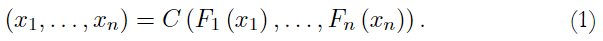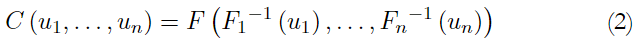 Definition 1.2. Sklar’s Theorem (1959). Let F be a n-dimensional distribution function with continuous marginals F1, . . ., Fn , there is a unique n-copula C: [0, 1]n → [0, 1] such that
