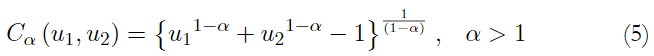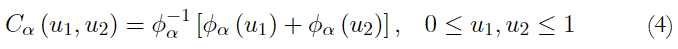 where ϕα is convex and decreasing such as ϕα 0. Function ϕα is the generator of copula Cα and ϕ−α 1 is the inverse of the generator, named Laplace transformed of a latent variable γ, which induces dependence α. The selection of a generator gives as a result different types of Archimedean copula. In this document Clayton copula is employed (Yaméogo & Barro, 2021).