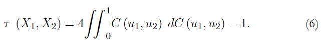 The Kendall’s τ is in function of the X1 and X2 copulas. In this study, there is a special interest in the Kendall rank correlation τ.