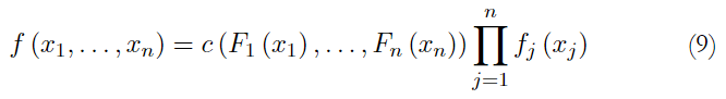 where c is the density of copula C. This result allows the selection of different margins and the dependence structure given by the copula to be used in the construction of a multivariate distribution. This contrasts with the usual procedure to generate a multivariate distribution because the restriction on the margins are usually of the same type (Zhi, Wang & Xu, 2021).