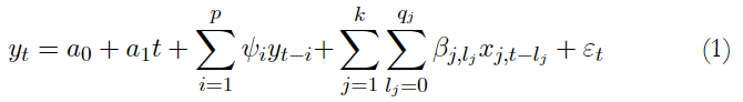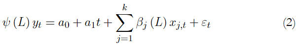 a0, a1, ψi y βj,l son, respectivamente, los coeficientes asociados con un intercepto, una tendencia lineal, los retardos de yt y los retardos de los k regresores xj,t para j = 1, . . . , k.