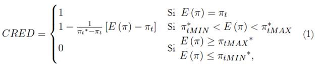 donde E (π) son las expectativas de inflación, πt es la meta central de inflación, πtMIN∗ y πtMAX∗ representan los límites inferior y superior de la meta de inflación. Por tanto, la credibilidad es total (CRED = 1) si las expectativas coinciden con la meta de inflación. La credibilidad es cero (CRED = 0) si las expectativas se salen de los límites de tolerancia. Por último, el índice de credibilidad tiene un valor entre 0 y 1 si las expectativas se sitúan dentro de los límites de tolerancia. Debido a su utilidad, este artículo utiliza el índice de De Mendonça (2007) para analizar el SPREAD.