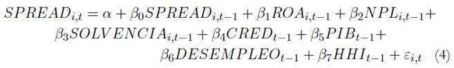 En orden de examinar el efecto de la concentración bancaria sobre el SPREAD, es extendido el modelo base considerado en la ecuación 2 para incluir el índice HHI como variable regresora. El modelo es el siguiente: