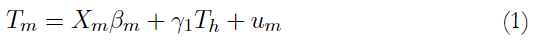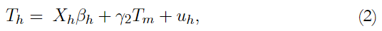 donde Tm> 0, Th> 0 son los vectores de tiempos dedicados a trabajo en el mercado y trabajo fuera del mercado (producción doméstica), respectivamente; Xm y Xh son matrices de variables explicatorias y βm y βh son parámetros asociados. Dado que se supone que las decisiones se toman de manera simultánea, el modelo se completa incluyendo en cada ecuación los tiempos dedicados a las actividades mencionadas: el tiempo dedicado a actividades en el mercado laboral depende del tiempo dedicado a actividades fuera del mercado y viceversa y γ1 y γ2 son sus parámetros asociados. Los términos de error um y uh se supone que cumplen con los siguientes supuestos: