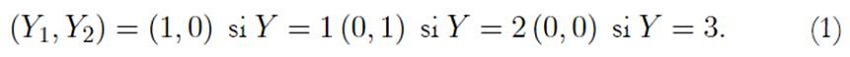 Esta es esgrimida en estructuras con más de dos categorías (politómicas) con variable dependiente de tipo nominal (Roque-Cruz, 2018; Gómez & Palacios, 2013). El proceso de cálculo se determina mediante la definición de una variable aleatoria dependiente de tipo nominal, politómica y categórica, de la forma (Y ) = {1, 2, 3} y con distribución de probabilidades p1 = p(Y = 1), p2 = p(Y = 2) y p3 = p (Y = 3) = 1 p1 p2, el objetivo de las variables consiste en analizar la influencia de las variables explicativas continuas x1, x2, sobre las formulaciones de probabilidad p1 y p2. La construcción de la variable Y por medio de vector, se representa de la siguiente forma: