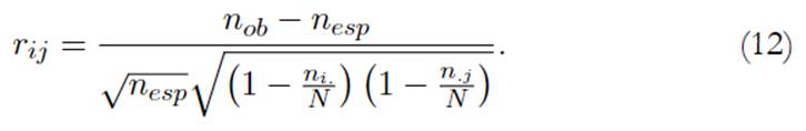 Una vez impuestas las observaciones, se analiza cómo se distribuyen con respecto a (i 1)(j 1) grados de libertad; asimismo, si dicha observación muestra que el p-valor es menor que el alfa de 0,05 se rechaza la hipótesis nula. Los residuos tipificados se calculan con la ecuación: