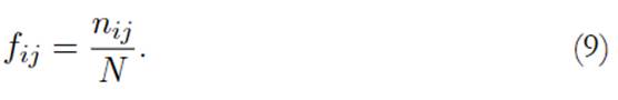 El siguiente paso es evaluar mediante la tabla de correspondencias la inserción de cada fila y columna con base en valores absolutos. A dichos valores se le denota genéricamente por nij , en el cual i representa las categorías de las filas, y j las columnas. El cálculo para la misma corresponde a: