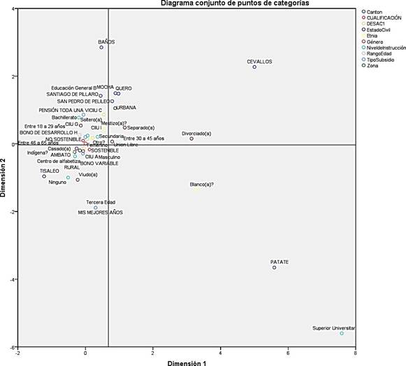 El diagrama en conjunto de puntos de categoría muestra el mapa de correspondencias con todas las variables categóricas. El cuadrante inferior izquierdo donde se ubica la sostenibilidad asocia a la actividad agricultura, ganadería y pesca, el Bono Variable, la educación secundaria y rango etario de 30 a 45 años. Adicional a esto, el género no es factor de disputa. En el apartado de no sostenible, ubicado en el cuadrante superior izquierdo, se puede observar al BDH, así como a la actividad económica de alojamiento y servicio de comidas y un rango etario de 46 a 65 años.