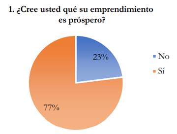 La Figura 3 establece que, del 100 % de las encuestas realizadas, el 77 % beneficiarios contestaron que se sienten a gusto con el desarrollo de su emprendimiento, por otra parte, el 23 % (53) aludieron que se encuentran en una etapa crítica, entre los comentarios enfatizan que la pandemia COVID-19 debilitó el nivel de ventas, limitó el número de salidas para la distribución de su producto y ciertos usuarios mostraron molestias por el desplazamiento de sus actividades económicas al no ser de primera necesidad.