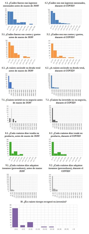 Asimismo, la Figura 5 detalla que los costos y gastos generados en la actividad reflejan una media mensual antes de marzo del 2020 fue de USD $135,93; mientras que durante el COVID es de USD $128,67; debido a la circunstancia y el riesgo existente el nivel de deuda para satisfacer necesidades operativas y de inversión se han visto sosegadas, teniendo una disminución de la deuda de USD $566,28 a USD $320,06, es decir, una disminución de USD $246,22, en otras palabras la adherencia a la deuda se comprimió en 43,47 %; por otro lado, la inversión antes de marzo del 2020 era mucho más alta que durante la pandemia, reflejando una diferencia de USD $810,26, en este aspecto se puede determinar que la paridad de deuda con inversión forjan una correlación de 0,280. También, la Figura 5 especifica que la temporalidad de recuperación de inversión determinó que el 69,91 % de los beneficiarios aún no recuperan la inversión, mientras que el 14,34 % recuperó en menos de 12 meses, el 14,35 % alude que recuperaron sus valores en un período de 12 meses, y el 7,39 % en un tiempo mayor a este.