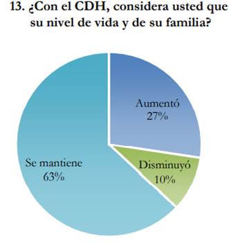 Aunque existen comentarios alentadores sobre el financiamiento, la mayoría destacaba que aún era insuficiente. La Figura 7 infiere que el desembolso realizado permitió al 27,39 % de los beneficiarios aumentar su nivel o calidad de vida, mientras que el 9,57 % no obtuvo resultados alentadores y la mayoría argumentaba que el nivel de vida seguía siendo el mismo y que no sentían un cambio significativo.