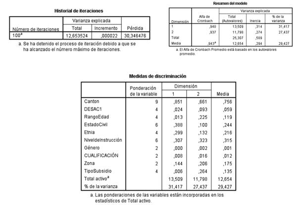 En las medidas de discriminación de la dimensión (1 y 2), se encuentra explicada principalmente por el Cantón con 0,851 y 0,661 respectivamente, el gráfico representa la misma información y refleja una significancia relativa y visible. Por otra parte, el valor que le sigue al cantón en la dimensión (1) es el estado civil 0,388 y en la dimensión (2) el nivel de instrucción con 0,323.