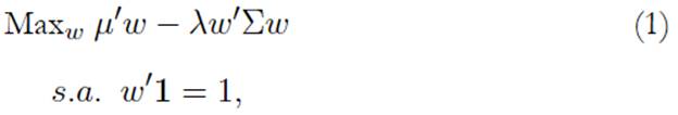 donde λ se define como la medida de aversión al riesgo, w es el vector (n x 1) de pesos de los activos que componen el portafolio, µ es el vector (n x 1) de retornos esperados de los activos (E (Ri )), Σ es la matriz (n x n) de covarianzas y 1 denota un vector (n x 1) de unos. Un supuesto importante del enfoque MV es que asume que µ y Σ son conocidos.