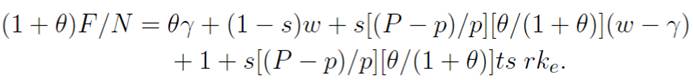 The quadratic equation solutions are a positive fraction and a number greater than unity. Only a fraction has economic meaning. Hence, given u, Equation (14) yields p, and Equation (16) determines t. Given the aforementioned status of pm from Equation (4), and given p from Equation (14), m is determined. Given τ, P, p, and m, the variables fk and M are determined by Equations (***) and (12), respectively. Given fw , fk , and u, the variable F is determined by Equation (13); and this variable, in turn, determines the variables KF and LF by Equations (2) and (3). Thus, the system solves 12 variables: w, r, p, m, P, M, ke , ke , F, KF , LF , and t. The gross domestic product is given by GDP = F + p(1 ─ u)Nm + PsN (M ─ m). Notice that the fraction of unemployed people (u) diminishes the demand for high- demand manufacturing goods (an unemployed person only gets the payment which buys the minimum food requirement).