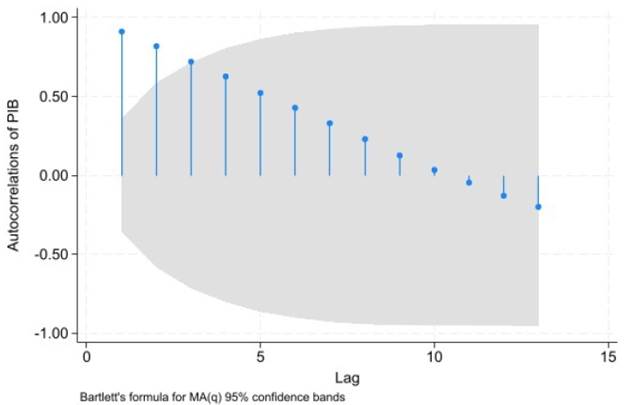 PIB. El primer indicio de estacionariedad de una serie, aunque de manera no formal, es proporcionado por la función de autocorrelación muestral. Un correlograma que desciende lentamente es indicativo de que las variables son de no estacionarias, un correlograma que desciende rápido es indicativo de