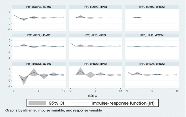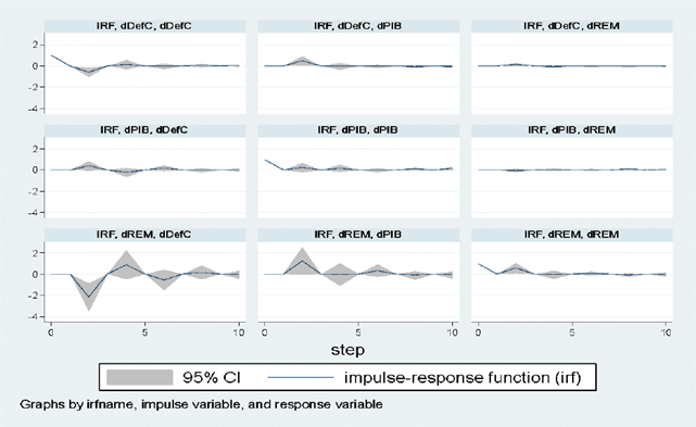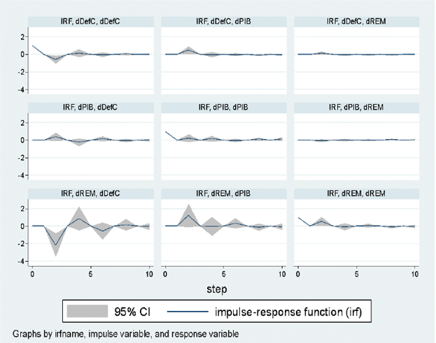Calculado el VAR, el proceso de transmisión o impacto de las variables es descrito por la función impulso respuesta (IRF). La IRF permite verificar la dirección del impacto de un choque de las variables. Muestran los efectos de los choques en la trayectoria de ajuste de las variables (Amuedo-Dorantes et al., 2010; Carter-Hill et al., 2011). La ecuación del VAR especificado es la siguiente: