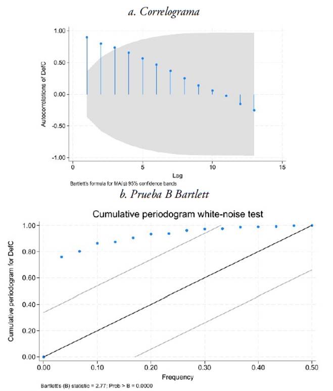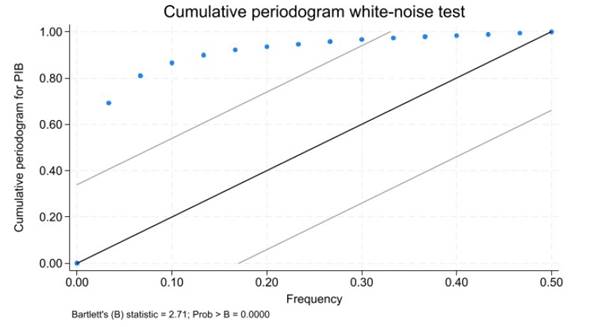 Una prueba formal para verificar la estacionariedad es la prueba B de Bartlett. Esta permite determinar si la serie es estacionaria o no (Bartlett, 1963). Se plantea las siguientes hipótesis con respecto a la serie PIB: