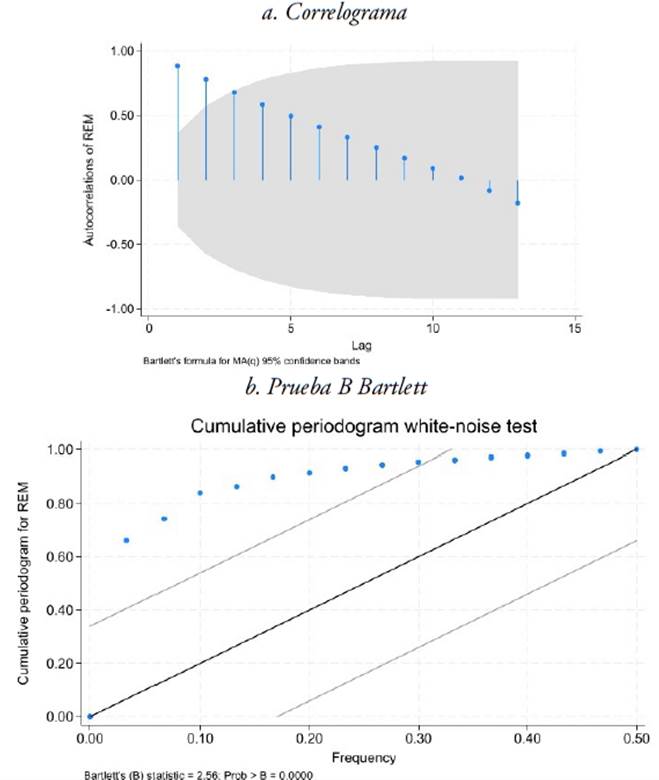 Remesas. El análisis visual de estacionariedad para la serie remesas realizada a través la Figura 3 destaca, al igual que para la serie PIB, indicios de no estacionariedad. Posteriormente, se practicó la prueba de Bartlett, destacando un valor estadístico de 2,56 y la probabilidad de 0,0000; menor al 0,05 evidenciando la no estacionariedad de la serie de remesas.