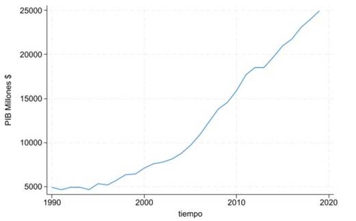 PIB. En principio, un análisis visual del comportamiento de la variable puede ofrecer un indicio del instante en que ha ocurrido el quiebre estructural. En general en Honduras, dadas las particularidades del país, las series tienden a mostrar la existencia de quiebres estructurales y es necesario identificar el momento de su ocurrencia. Haciendo uso del comando tsline PIB del software estadístico Stata versión 16, la Figura 5 expone el comportamiento de la variable PIB a partir del año de 1990. Se observa de manera acentuada un cambio en el recorrido de la variable en el año 2012.