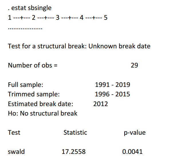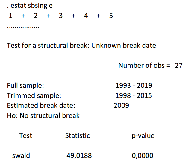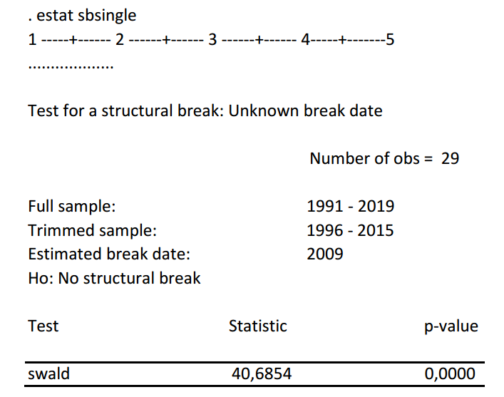Para confirmar el quiebre identificado de manera informal a través de la Figura 6, se realizó con la ayuda del software Stata, la prueba de cambio estructural endógeno. La Hipótesis que plantea la prueba es la siguiente: