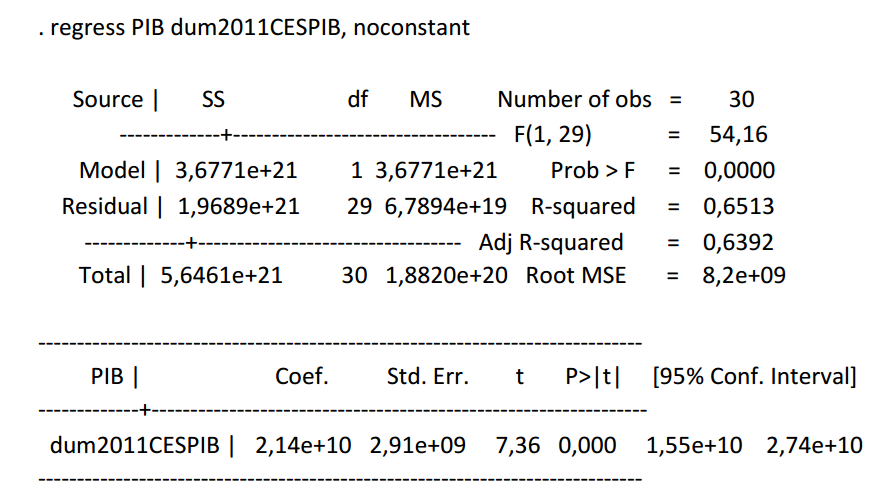 Confirmado el cambio estructural, este se corrigió. Para ello se generaron variables dummy para el año en que ocurrió el cambio estructural en el PIB. Esta variable ficticia contiene valores de cero para los años 1990 a 2011 y valores de uno a partir del 2012 y hasta el año 2019. Una vez generada la variable dummy, se ejecutó la regresión mostrando que la variable dummy creada es significativa (Tabla 2), por lo tanto, es necesaria su inclusión para corregir el cambio estructural. Posteriormente, se calculó un nuevo valor del PIB ajustado ya a los cambios estructurales.