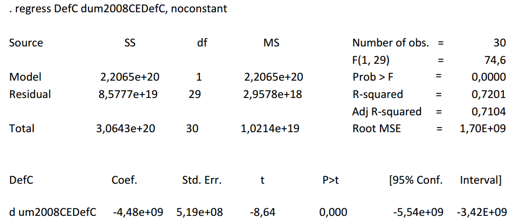Confirmado el cambio estructural, este se corrigió. Se generaron variables dummy para el año en que ocurrió el cambio estructural de la variable. La dummy contiene valores de cero en el periodo 1990 a 2008 y valores de uno a partir del año 2009 y hasta 2019. Una vez generada la variable dummy, se ejecutó de nuevo la regresión.