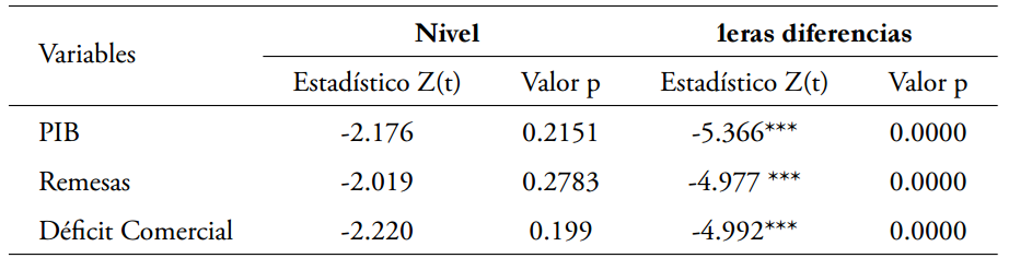 Luego de identificar indicios de estacionariedad y cambios estructurales en el PIB, las remesas y el déficit comercial, corresponde realizar pruebas para verificar la existencia o no de raíz unitaria en las variables. Se utilizó la prueba de Phillip Perrón, desarrollada por Peter Phillips y CB Pierre Perron (Phillips & Perron, 1988). La prueba se aplicó sobre los valores ajustados de las variables y también sobre la primera diferencia de estos valores ajustados. La prueba de raíz unitaria de Phillips-Perrón plantea la siguiente hipótesis: