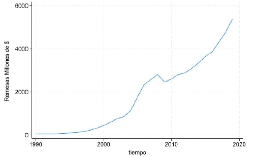 Las remesas se han convertido en una fuente significativa de ingresos. En la actualidad constituyen para muchos países, la segunda causa generadora de divisas, después de la inversión extranjera directa e incluso, superan la barrera del 20 % de participación en el Producto Interno Bruto (Bettin & Zazzaro, 2011; López-Parra & Cruz-Rodríguez, 2016). La importancia es tal que en las últimas décadas las remesas internacionales que llegaron a los países en desarrollo se han incrementado en más de un 300 % (Castles & Delgado, 2007; Guha, 2013). En 2019 fueron USD 554 mil millones a nivel mundial, 8,2 % superior al año anterior y USD 97173,86 millones para América Latina y el Caribe, representando 17 % del total de las remesas. Los tres principales receptores en el mundo fueron India, China y México. Mientras que en nuestra región México, Guatemala y República Dominicana recibieron mayores volúmenes de remesas (Orozco, 2020; World Bank Group & KNOMAD, 2020).