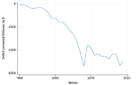 Déficit comercial. Al igual que para las variables antes expuestas, en primera instancia mediante un análisis gráfico se corroboró la trayectoria en el tiempo de la variable. Desde la perspectiva visual, el cambio estructural se observa en el año 2008. A nivel internacional ese año estalló la crisis financiera, sobre la que se podría atribuir dicho quiebre estructural. La Figura 7 refleja la trayectoria de la variable y se puede observar un quiebre en la línea en el año 2008.