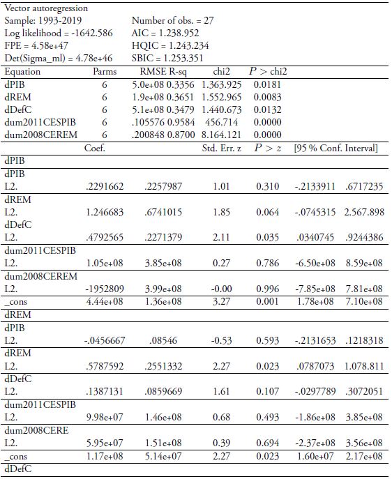 Para estimar el efecto de las remesas de trabajadores sobre el Producto Interno Bruto y el déficit comercial, se determinó utilizar el modelo del tipo vector autorregresivo (VAR). Este método tiene el aval de importantes econometristas que lo consideran un recurso robusto en el área económica. Novales (2017) afirma que el VAR permite caracterizar las interacciones simultáneas que se dan entre un grupo de variables. Es un modelo de ecuaciones simultáneas sin restricción, indicado para datos de series temporales. Por su parte, Gujarati y Porter, (2010), arguyen que es un método simple, cuyas predicciones obtenidas “son en muchos casos mejores que las obtenidas con modelos de ecuaciones simultáneas más complejos” (p. 788).