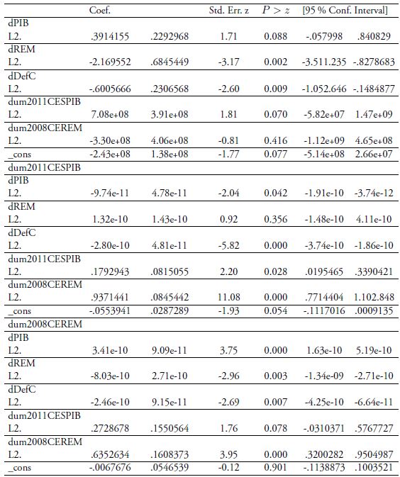 Para la ecuación que contiene el DefC como variable dependiente, las remesas son positivas, su valor p igual a 0,002 es estadísticamente significativa al 0,01 %, lo que posiciona a las remesas como un predictor útil del déficit comercial. Las remesas podrían causar déficit comercial mediante el incremento de las importaciones ya sea de bienes de transformación, bienes de consumo o bienes suntuarios. Esta posición sigue la línea de los resultados encontrados por Cáceres y Saca, (2005), en El Salvador donde las remesas podrían causar el incremento de las importaciones de bienes y ser canalizadas para el consumo solamente. También en Nepal se encontró causalidad unidireccional de largo plazo de las remesas sobre el déficit comercial y las importaciones (Bhatta, 2013). Por último, Loser et al. (2006) encontraron que las remesas aumentan las importaciones. En cambio, el PIB no es estadísticamente significativo al 0,05 %. Sí lo es a un nivel de significancia del 0,1 por ciento. Finalmente, siendo la variable dependiente, ninguna de las variables independientes PIB y DefC son significativas para predecir la causalidad en las remesas.