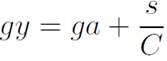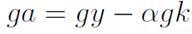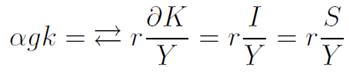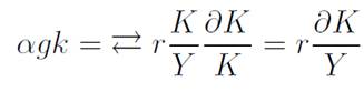[5]La ecuación 5 se puede descomponer en términos mucho más precisos y concretos: α es la participación de las ganancias dentro del producto, o la participación de la remuneración al capital en el producto, esto es rK/Y , de donde r es la remuneración a una unidad de capital que debe ser igual al producto marginal del capital ∂Y /∂K. En consecuencia, αgk debe ser igual a: