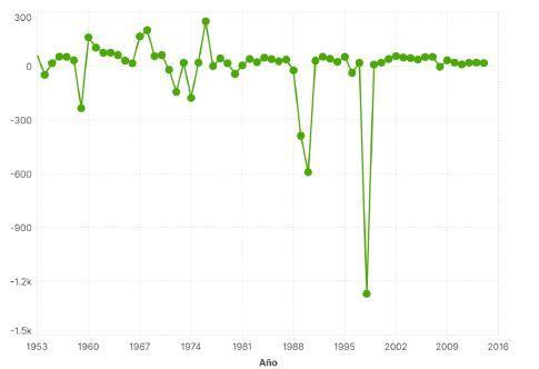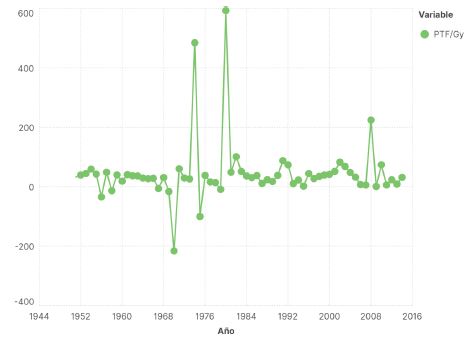 Al observar la PTF en este periodo se concluye que sigue el mismo comportamiento de la tasa de crecimiento económico, es decir, cuando esta sube también lo hace la PTF y viceversa. Esta variable creció en promedio 0,88 % en todo el periodo ligeramente inferior al crecimiento de la PTF en China de 0,95 %. También tuvo tasas de crecimiento negativas muy fuertes como del -2,5 en 1974 y del -1,5 % y 1,9 % en 1984 y 1986, respectivamente, los cuales coinciden también con tasas de crecimiento económico negativas.