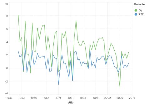 En la Figura 3 se observa la evolución de la tasa de crecimiento de la economía de Estados Unidos y de la productividad total de los factores (PTF) en el periodo 1951-2014.