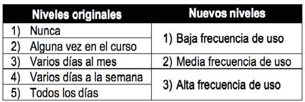 Análisis diferencial en función del grado de presencia de las TIC en la vida cotidiana de los docentes, su familiaridad y competencia en el uso de las TIC. Al comparar las distribuciones de respuestas ofrecidas por los docentes en cada uno de los conglomerados obtenidos, lo que se observa es que el profesorado con mayor integración de las TIC tiende a usar más frecuentemente las TIC en su vida cotidiana, es decir, está más familiarizado con ellas: usan más el ordenador, acceden con mayor frecuencia a Internet o usan más las tabletas o similares.