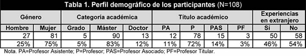 Para el reclutamiento de los participantes adoptamos una combinación de conveniencia y estrategias de muestreo de referencia. Contactamos con profesores en diferentes universidades chinas, les invitamos a participar en el estudio, y les pedimos su ayuda en el reclutamiento de colegas. Finalmente se involucraron 108 profesores de inglés como lengua extranjera de 38 universidades ubicadas en diferentes regiones chinas. La tabla 1 resume la información demográfica relacionada con estos participantes. Asimismo la muestra oscilaba entre los 25 y los 50 años de edad (M= 34.33, SD=4.99) y estaba compuesta predominantemente por profesoras, reflejando las distribuciones típicas del género de la disciplina dominada por las mujeres en las universidades chinas. Constaba de profesores con mucha experiencia y también noveles. De los 107 encuestados que suministraron información sobre su antigüedad en la enseñanza, se reflejó un promedio de 9,47 años (SD=5.39; gama=1-27). Una gran mayoría de participantes tenía el grado de maestría y tenía una categoría académica de profesor. Un poco menos de la mitad de participantes tenía experiencia académica en el extranjero, es decir, había estudiado en universidades en países anglófonos o en ambientes de inglés como segunda lengua (ESL), tales como Hong Kong y Singapur, donde se adoptan las nociones angloamericanas del plagio.