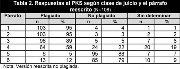 Con el PKS se recogieron dos tipos de notas: las de conocimiento del plagio (notas de conocimiento de ahora en adelante), y las de postura o actitud hacia el plagio (notas de actitud de ahora en adelante). Las notas de conocimiento se calcularon según Roig (2001). Para cada participante se asignó un punto para cada versión reescrita correctamente identificada, dos puntos para cada versión no identificada (incluyendo tanto los casos de «no se puede determinar» como los casos en que un participante no podía opinar), y tres puntos para la versión incorrectamente identificada. El participante que identificaba correctamente todas las versiones reescritas obtenía una puntuación perfecta de seis puntos, en el caso contrario obtenía 18 puntos. Por lo tanto, las notas más bajas podían indicar un mejor conocimiento del plagio y de la paráfrasis. Se obtuvieron las puntuaciones sobre la actitud calculando el promedio de las estimaciones dadas por cada participante para los párrafos reescritos que él o ella consideraba plagiados (sin considerar si el párrafo fue diseñado como un caso del plagio o una paráfrasis apropiada). Cuanta más alta fuera la nota sobre actitud, más indulgente sería el participante hacia el plagio reconocido. Se analizaron con SPSS (versión 23.0) las notas obtenidas para conseguir datos estadísticos descriptivos e inferenciales necesarios para responder a nuestras preguntas de investigación.