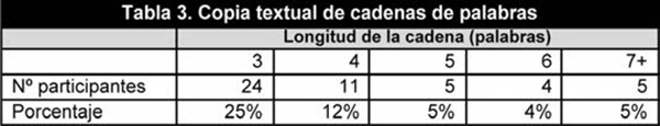 Entre los 108 participantes, 102 ofrecieron justificaciones escritas para sus juicios con respecto a las versiones reescritas. Se reveló en un análisis de estas justificaciones que ellos utilizaron tres criterios al evaluar los párrafos. En primer lugar, muchos basaron sus comentarios por la extensión en que cambiaba el párrafo original. Alrededor del 65% de los participantes señalaron que para evitar acusaciones de plagio, se tenía que reescribir el párrafo original para cambiar su estilo y estructura, como lo demuestran las siguientes justificaciones: